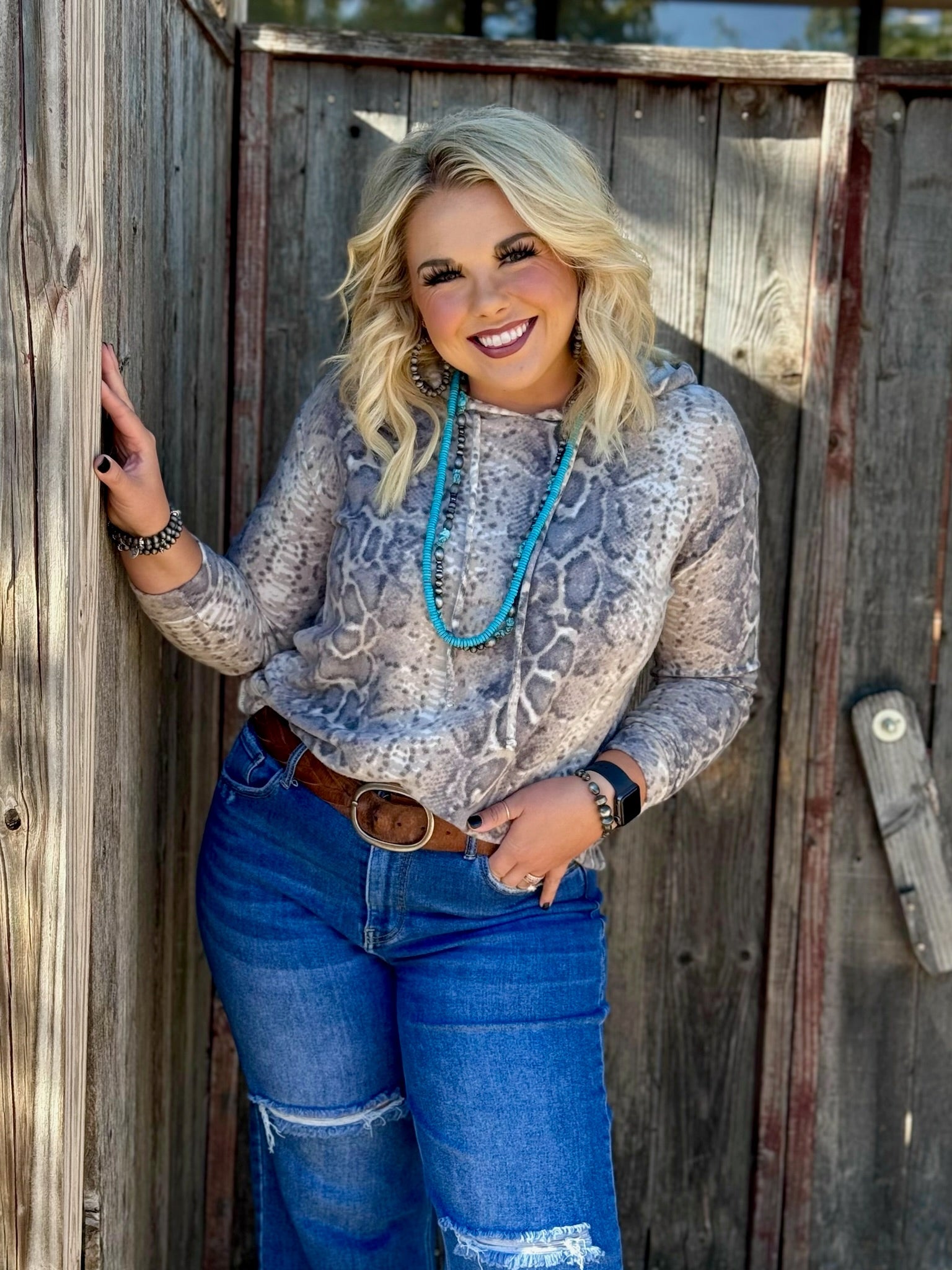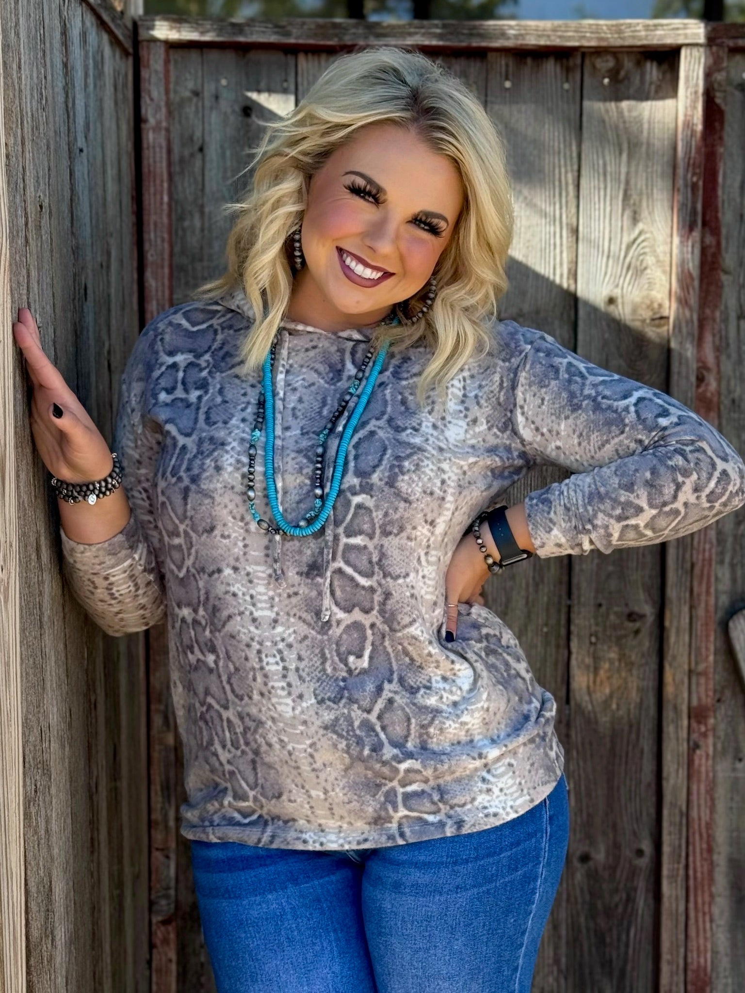 This snakeskin hooded top is AMAZING! Super soft, cozy, and the perfect length to throw on with tights and booties!
